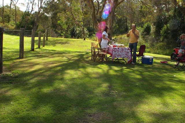 We took, hot chicken, salads, rolls, and wine down to the shady spot I like best and set up our goodies. Unfortunately Alicia wasn't with us, but I guess I will have to get used to that, she is mother herself now and of course celebrates with her own little family too. They were away in Brisbane so missed lunch but of course I saw her later in the day.